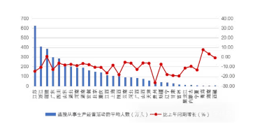 圖 4 2025 年上半年各地區(qū)直接從事生產(chǎn)經(jīng)營(yíng)活動(dòng)的平均人數(shù)及其增長(zhǎng)情況